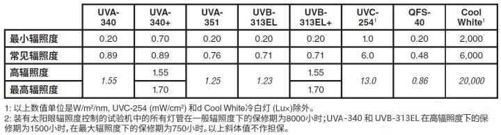 有太陽眼輻照度控制系統(tǒng)的設(shè)備可以設(shè)定輻照度水平。例如, 對于 UVA-340燈管, 設(shè)定0.89W/m2@340nm的輻照度和夏天正午時光強(qiáng)相當(dāng)。為了更快地得到測試結(jié)果,紫外老化箱QUV可被設(shè)置在夏天正午光強(qiáng)200%條件下運(yùn)行。基于不同燈管類型下表列出最高輻照度水平及一些常用的輻照度設(shè)置點(diǎn)。