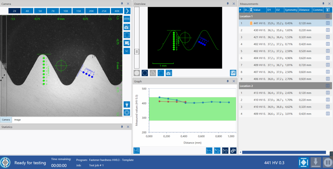 顯示了應進行壓痕測試的位置,以及實際的洛氏測試