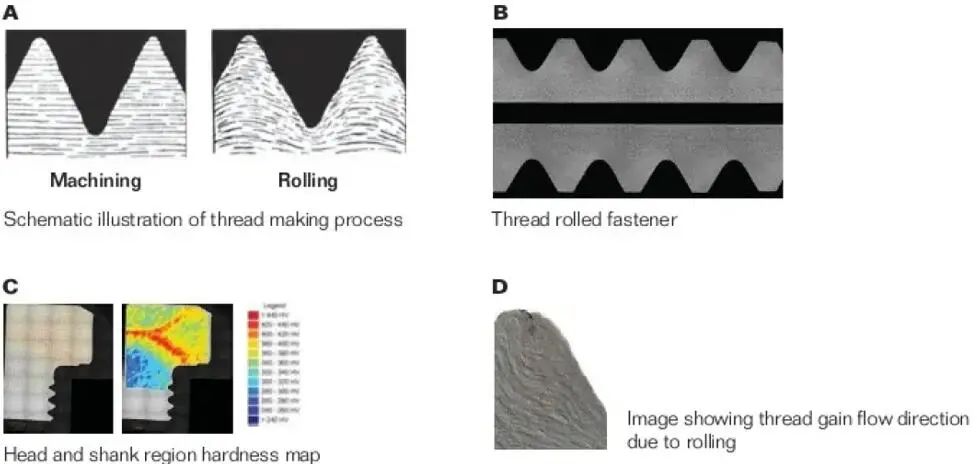 此外,螺紋滾壓工藝作為一種常見的強化方法,與螺紋加工緊固件或未滾壓螺紋的熱處理緊固件相比,滾壓工藝可將材料強度提高至少25%,并且具有將疲勞強度提高75%的額外優勢。可以進行硬度測試來判定這些方法的不同。