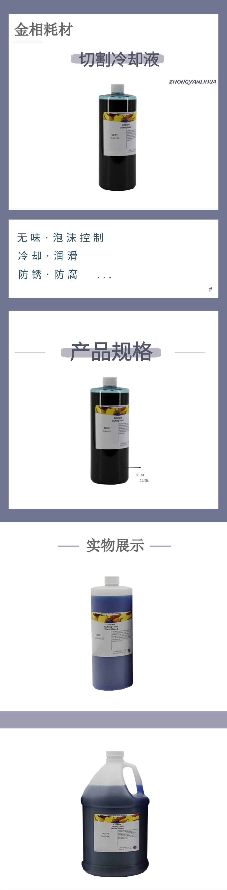 含有防銹添加劑,藍(lán)色,無味,泡沫控制,不含硫和硝酸鹽。適用于對(duì)水不敏感的材料的切割。 與水混合比1:20 |