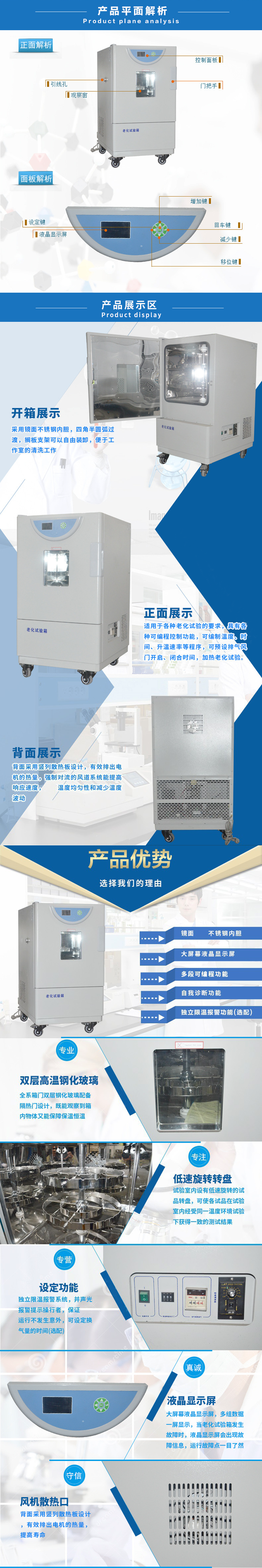 當(dāng)老化試驗箱發(fā)生故障時,液晶顯示屏?xí)霈F(xiàn)故障信息,運行故障點一目了然。